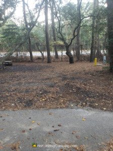 Campsite 25 is a 20′ site that has a pine straw and compacted dirt driveway. It has a small campsite area to the left and it backs up directly to the fence along Shore Drive. It sits lower so after heavy rains the water will settle in the campfire area. This site sits directly across from campsite number 26 and campsite number 27 is directly to its left.