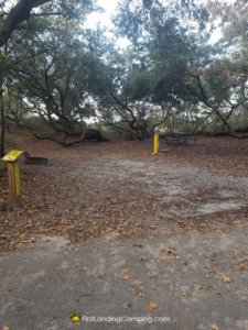 Campsite 30 is a 20′ site that has a picnic area located to the right and nice the fire pit is on the far left. It has nice tree coverage that provides shade and a compacted dirt and gravel drive. The fence across the street on Shore Drive is visible.